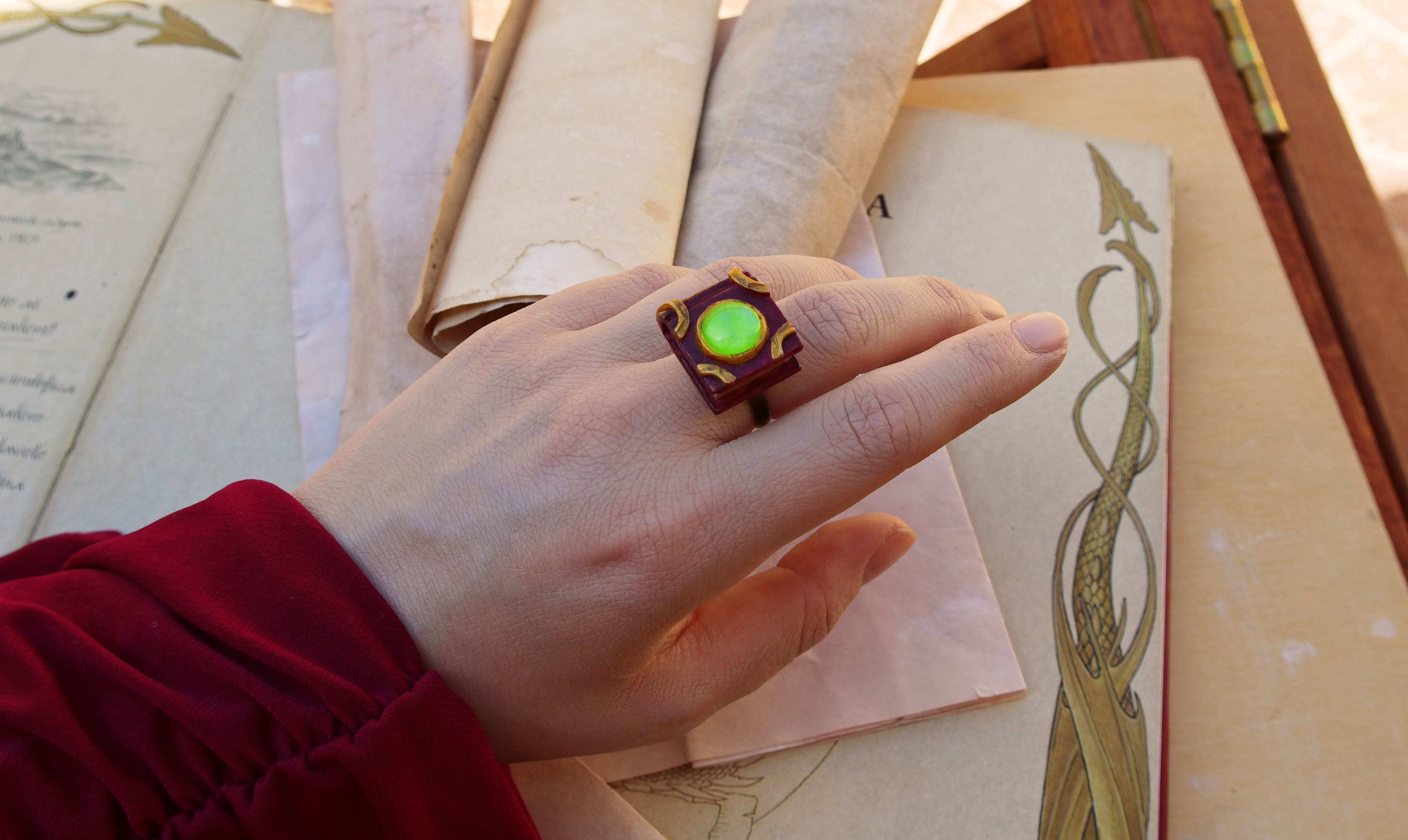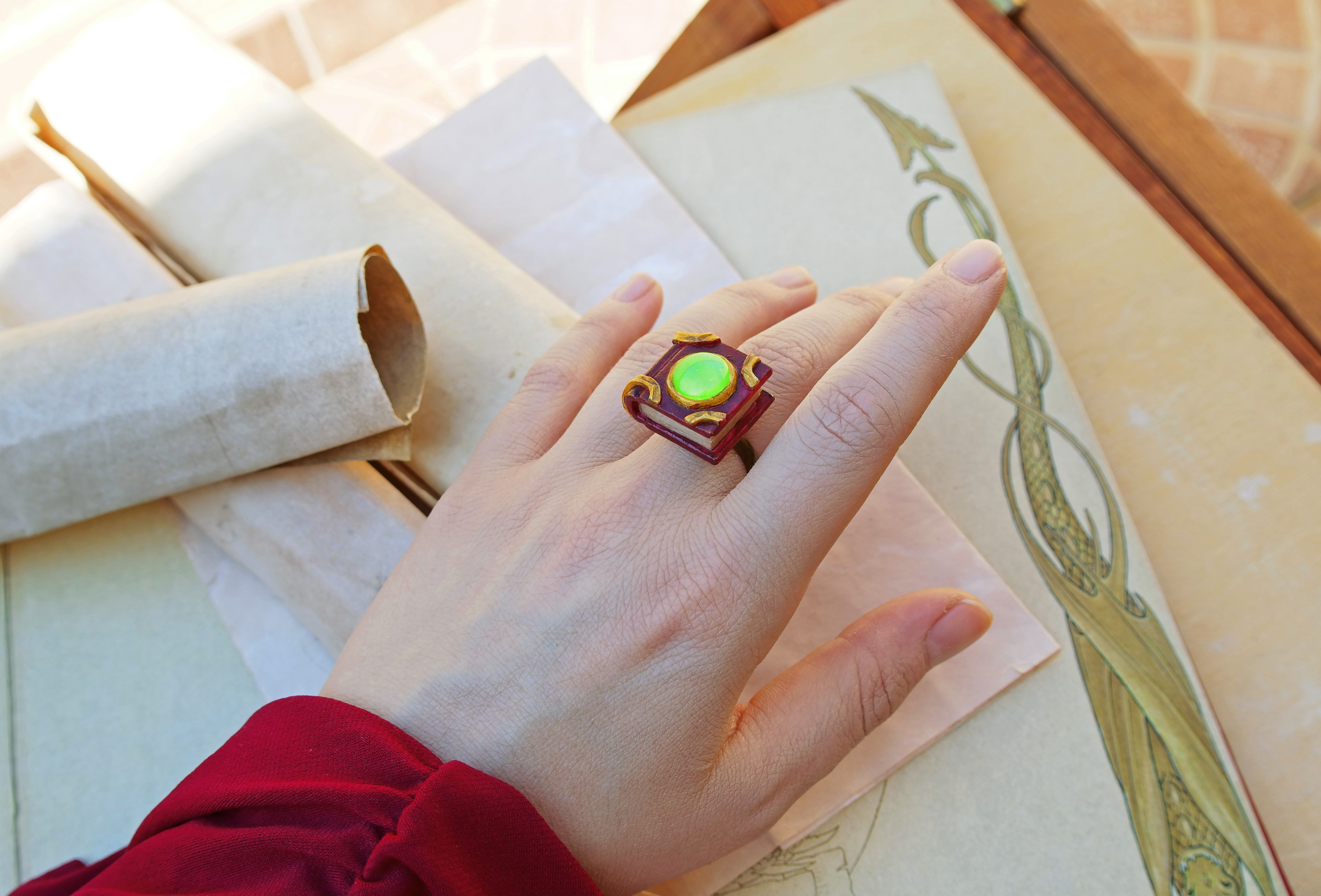 ⌘ This tiny reproduction of a book measures only 1,5x2x1 cm (0.59x0.78x0.39 inches) and it is resting on an adjustable brass band as the central piece of a one of a kind ring (sizes for the ring: US size 6.75 to 8.5). After a brief charge time under uv light the central green cabochon glows in the dark with an acid green light. This ring comes in a burgundy organza pouch, ready to be gifted.