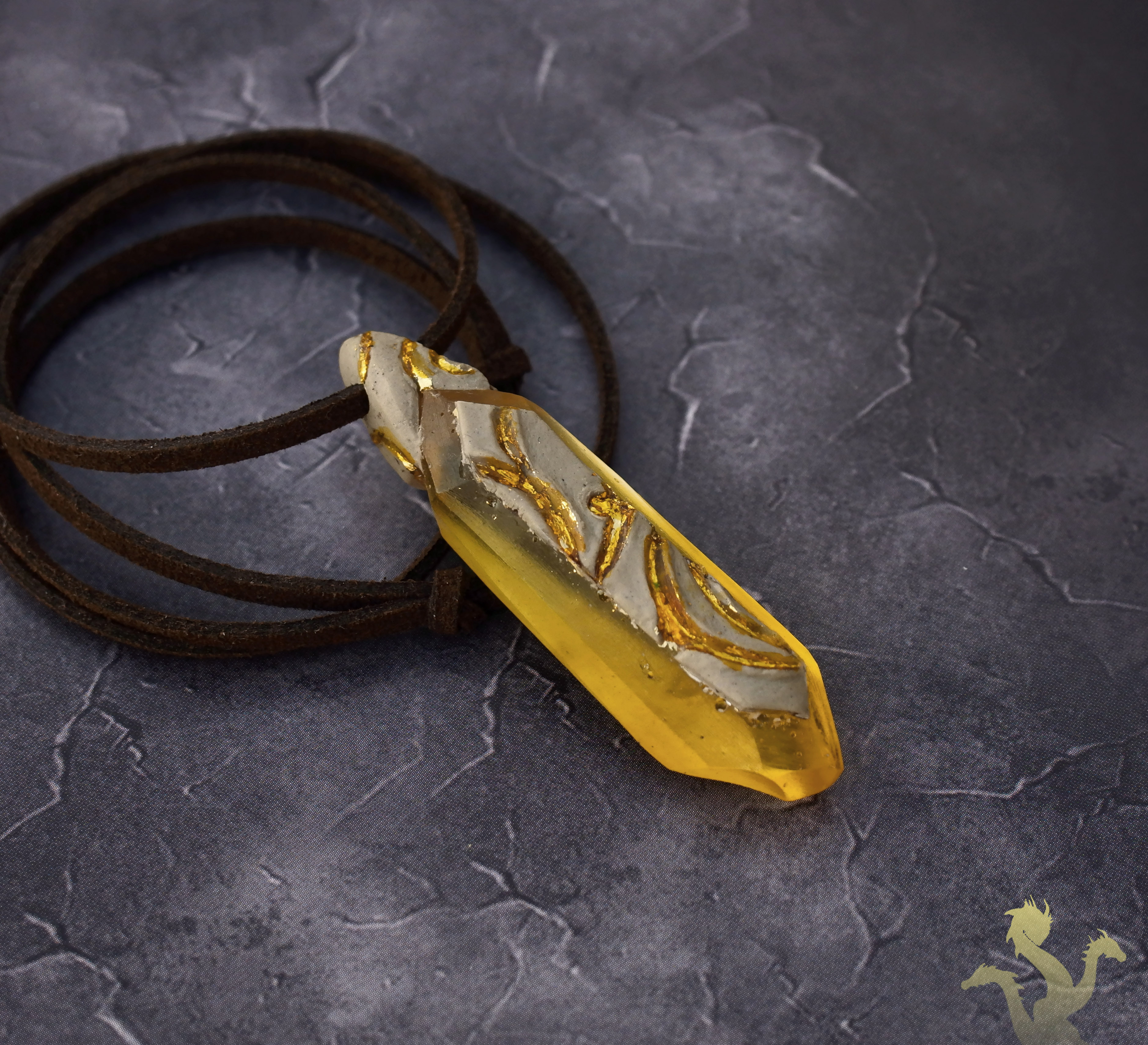 This lightweight resin crystal has the same color of sunlight. Tribal carvings, glimmering in honey-gold, cover the stone-like texture of the central facet and necklace loop.