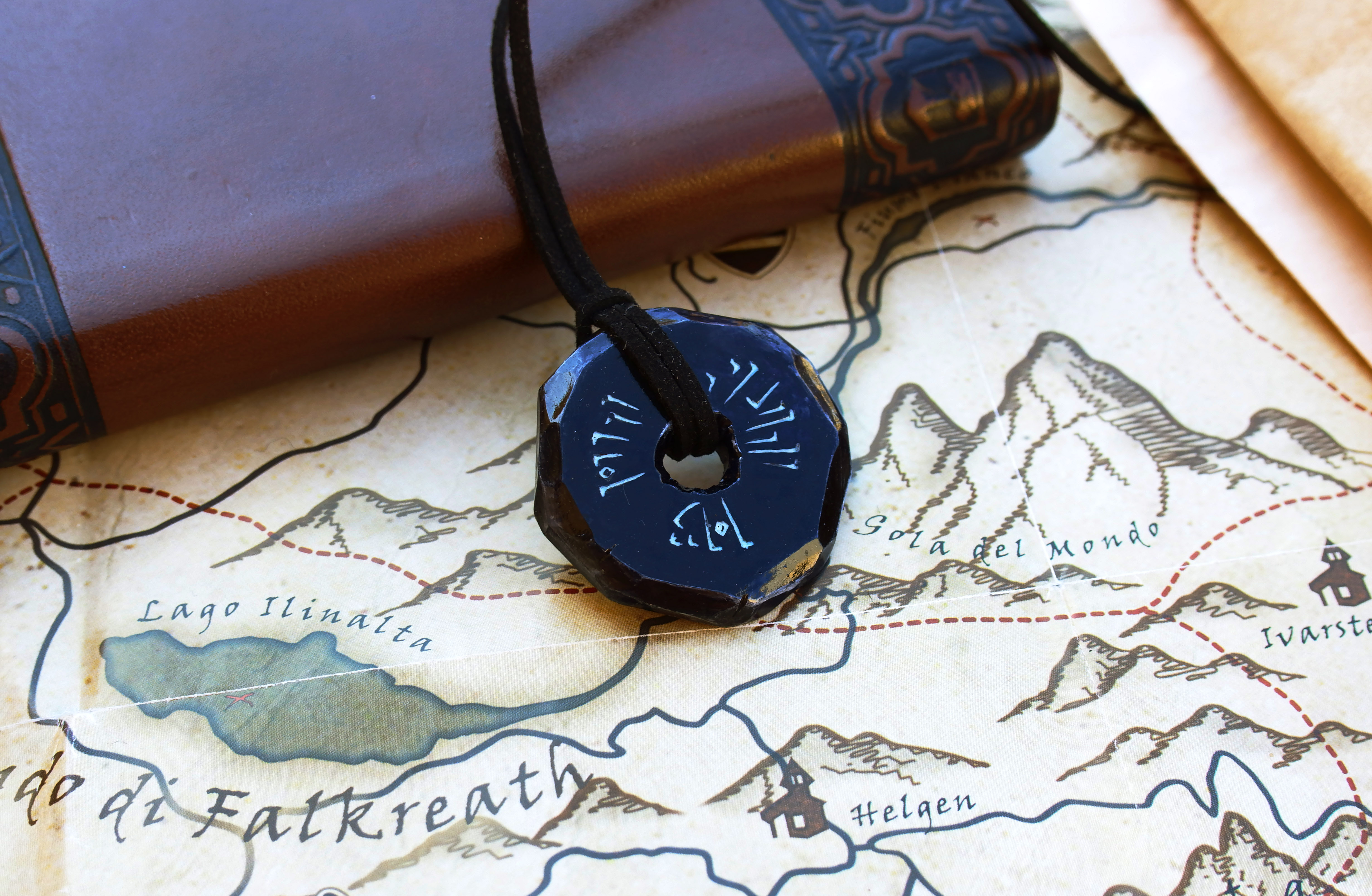 The thu'um pieces are amidst my most loved creations. I took inspiration from the shapes of viking jewellery and thus rearranged the dovazhul inscription for the FUS RO DAH into a circular shape. I wanted the necklace to appear unrefined though, something resembling a shard of rock from a wall of power or a clear piece of everlasting ice, in its crude form, etched to contain the dragon power. I work on polymer clay to make the sharp circle and patiently etch each dovazul rune on the surface, then, to achieve the high transparency, I cast a silicon mold and use resin to have the final piece. I styled different prototypes to make each of the final necklaces special, and at the end of the process I handpaint the glowing runes, the lights and shades and protect the paint with a sealant in order to achieve the final thu'um necklace.