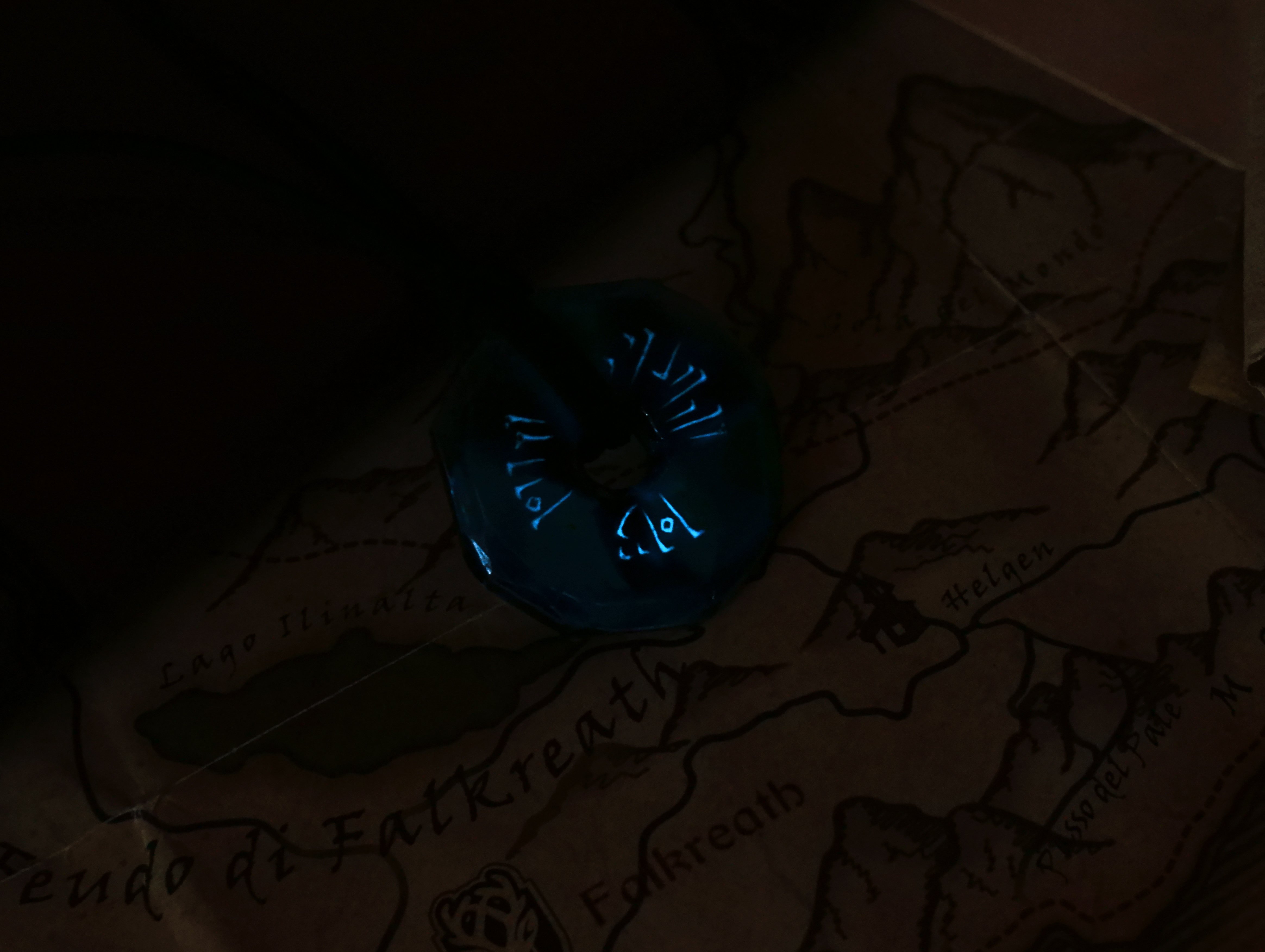 The thu'um pieces are amidst my most loved creations. I took inspiration from the shapes of viking jewellery and thus rearranged the dovazhul inscription for the FUS RO DAH into a circular shape. I wanted the necklace to appear unrefined though, something resembling a shard of rock from a wall of power or a clear piece of everlasting ice, in its crude form, etched to contain the dragon power. I work on polymer clay to make the sharp circle and patiently etch each dovazul rune on the surface, then, to achieve the high transparency, I cast a silicon mold and use resin to have the final piece. I styled different prototypes to make each of the final necklaces special, and at the end of the process I handpaint the glowing runes, the lights and shades and protect the paint with a sealant in order to achieve the final thu'um necklace.