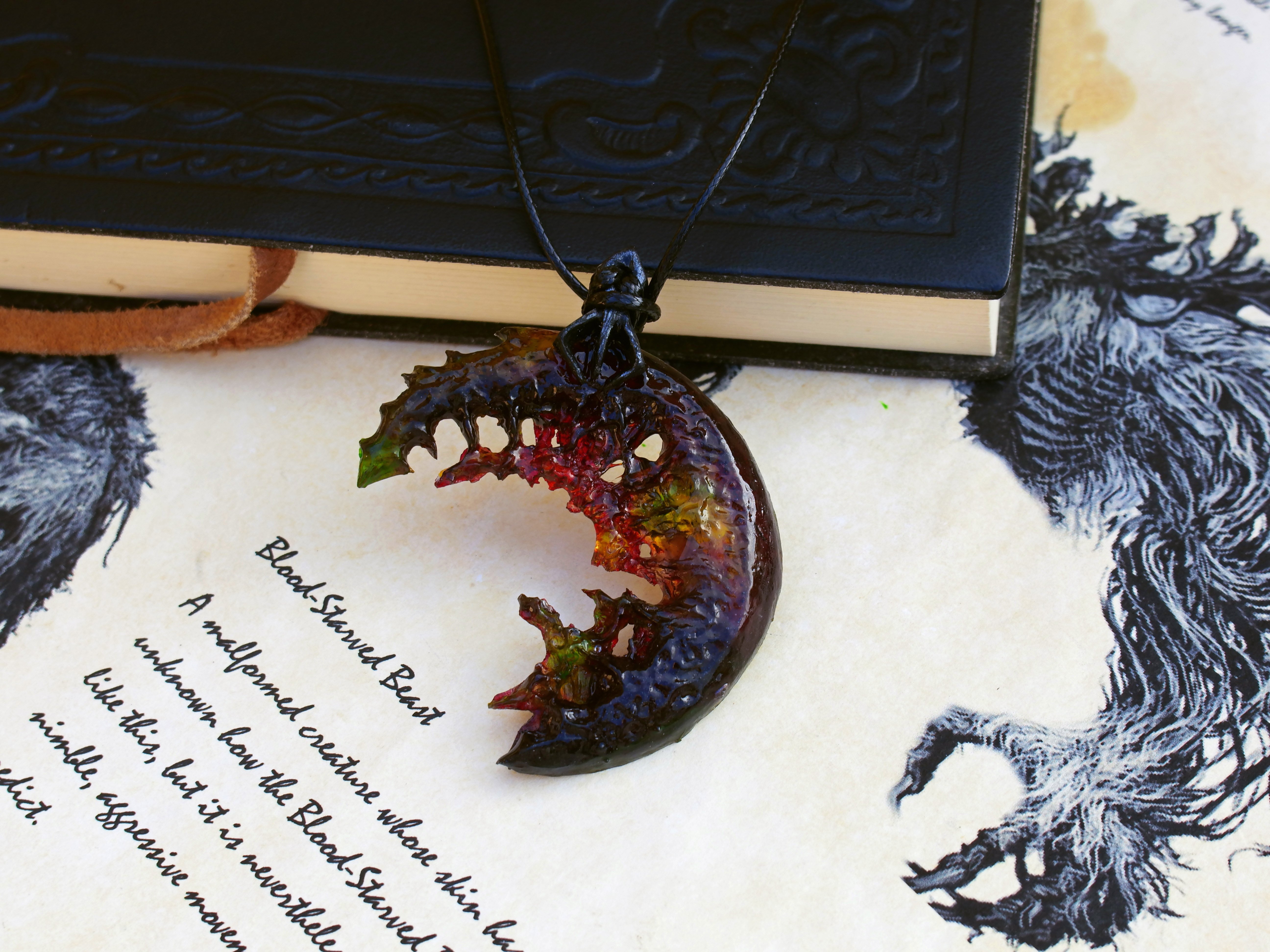 ☾ I shaped and sculpted the first crescent shaped protype with polymer clay. I tried to render a kind of organic-crystal structure, since in the game lore these gems are made of blood. The final crescents are made from clear resin mixed with pigments and inks for an ever different final look. I sand and reshape the pendant to give it a more unique and organic look, add the last shades and seal the painting.