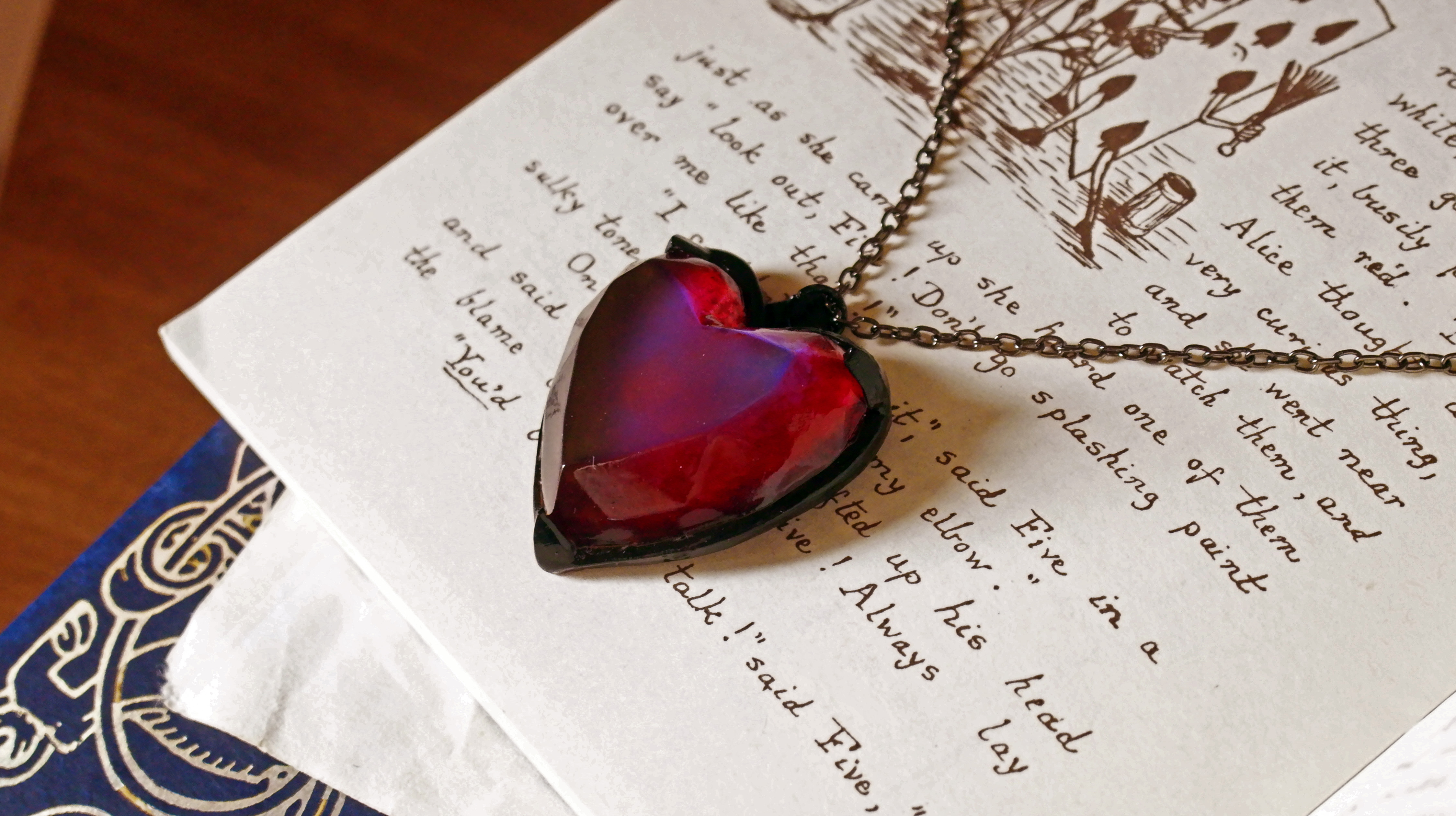 Metaessence necklace is inspired by American McGee's Alice videogame. It's a reinterpretation of the health source found by Alice through the game, and as such, it's the perfect gift for any fan of this eerie and intense videogame. It comes in a black paper box, ready to be gifted.