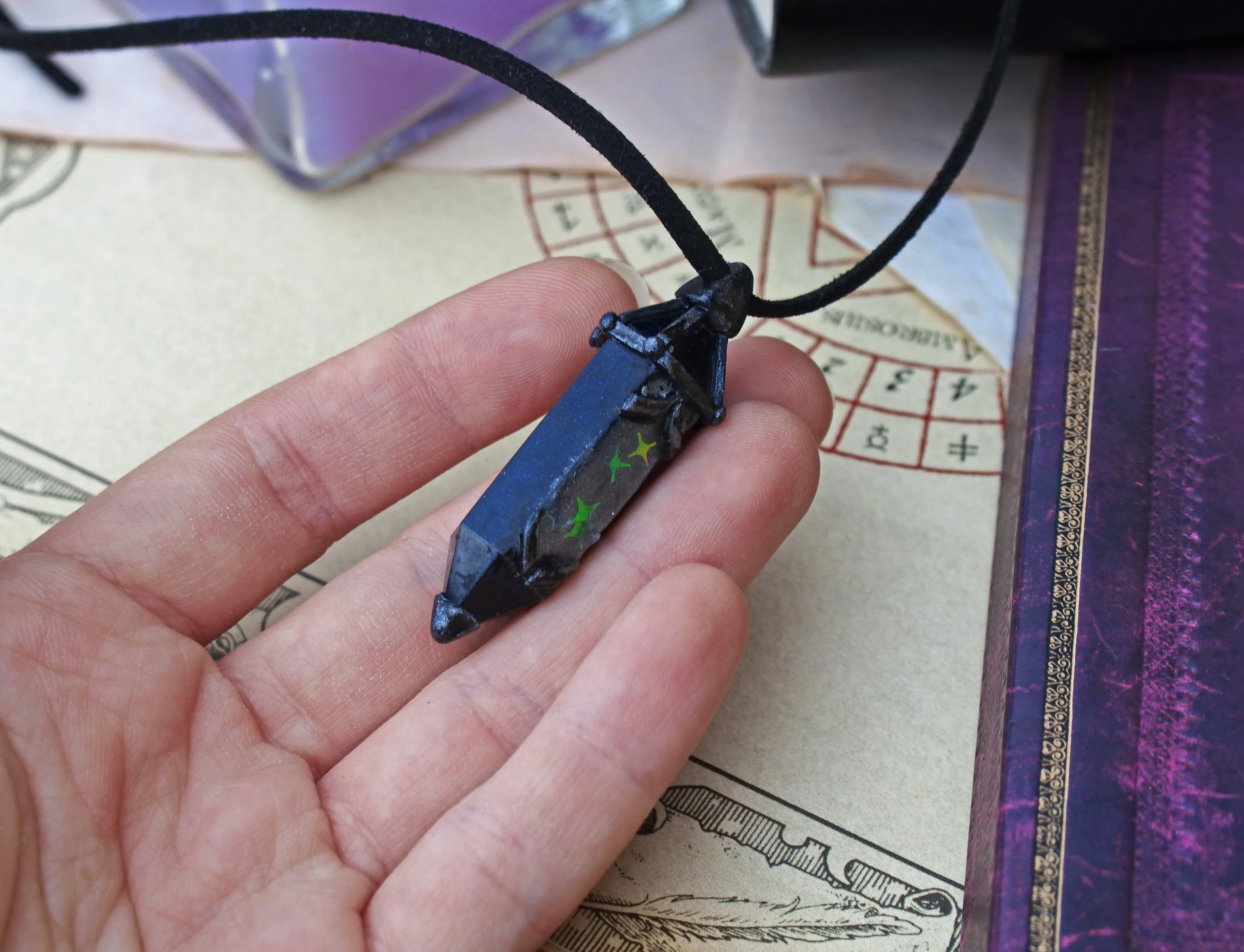 This lightweight resin crystal is a one of a kind pendant: hand-sculpted motifs and holographic details make this necklace a unique piece, a small token of a fantasy world, ready to spice up your day with a little magic!