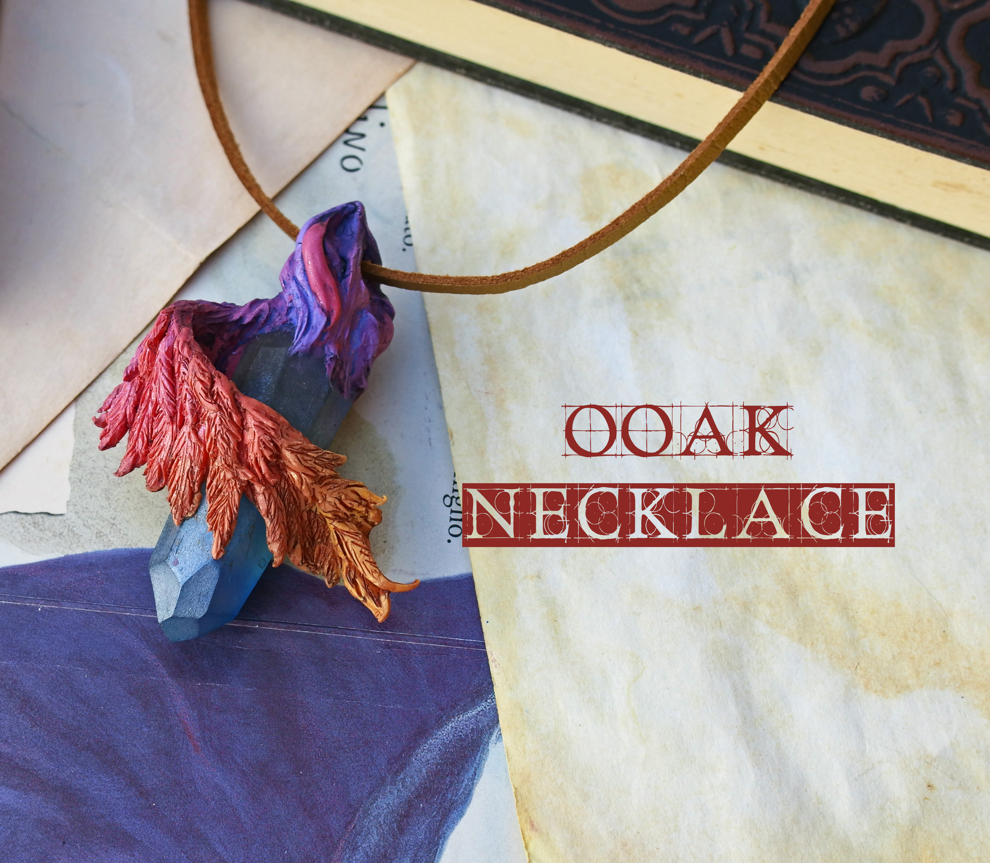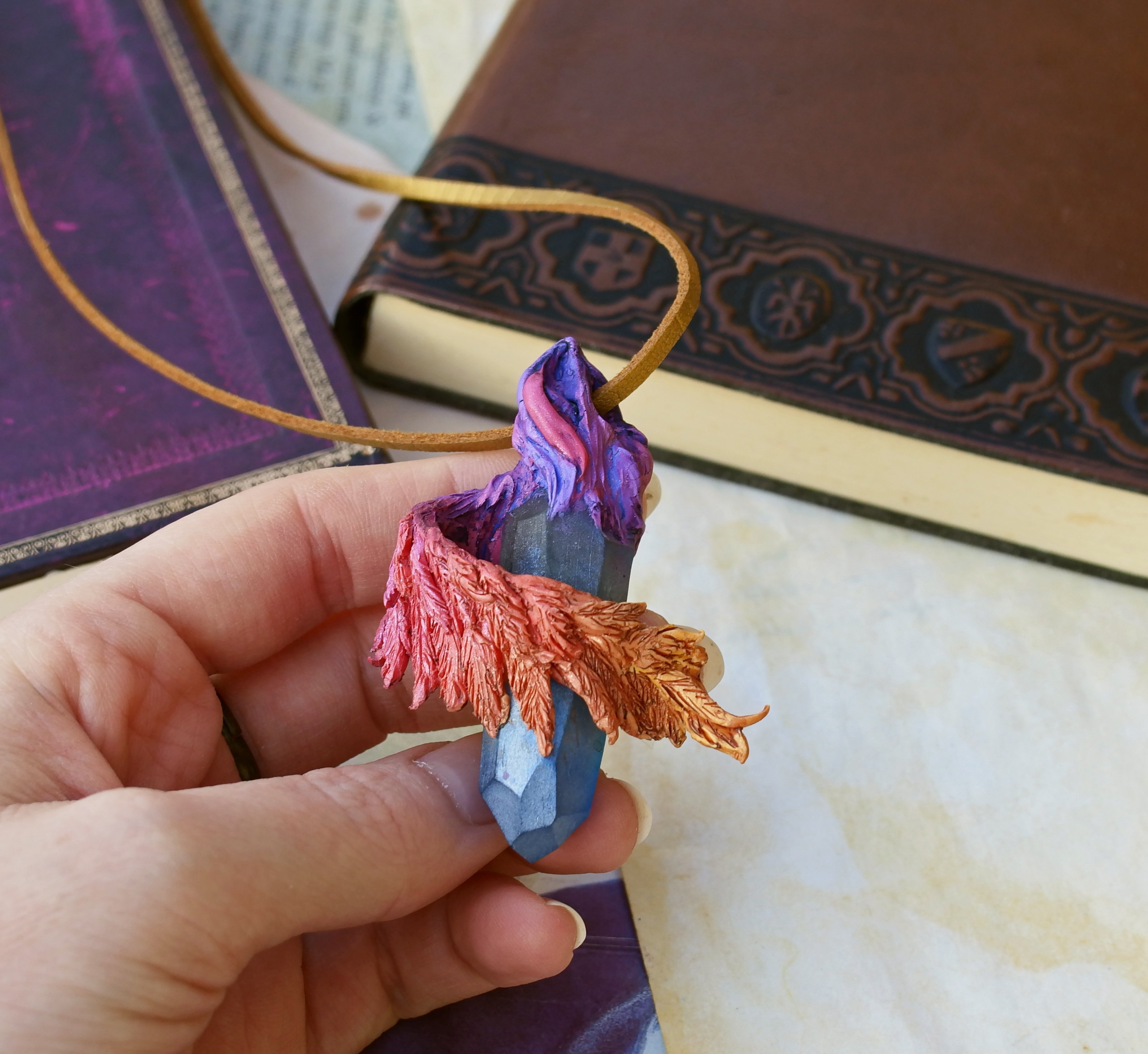 This lightweight resin crystal is a one of a kind pendant: colored flame-like feathers wraps around this crystal, making a unique piece, a small token of a fantasy world, ready to spice up your day with a little magic!