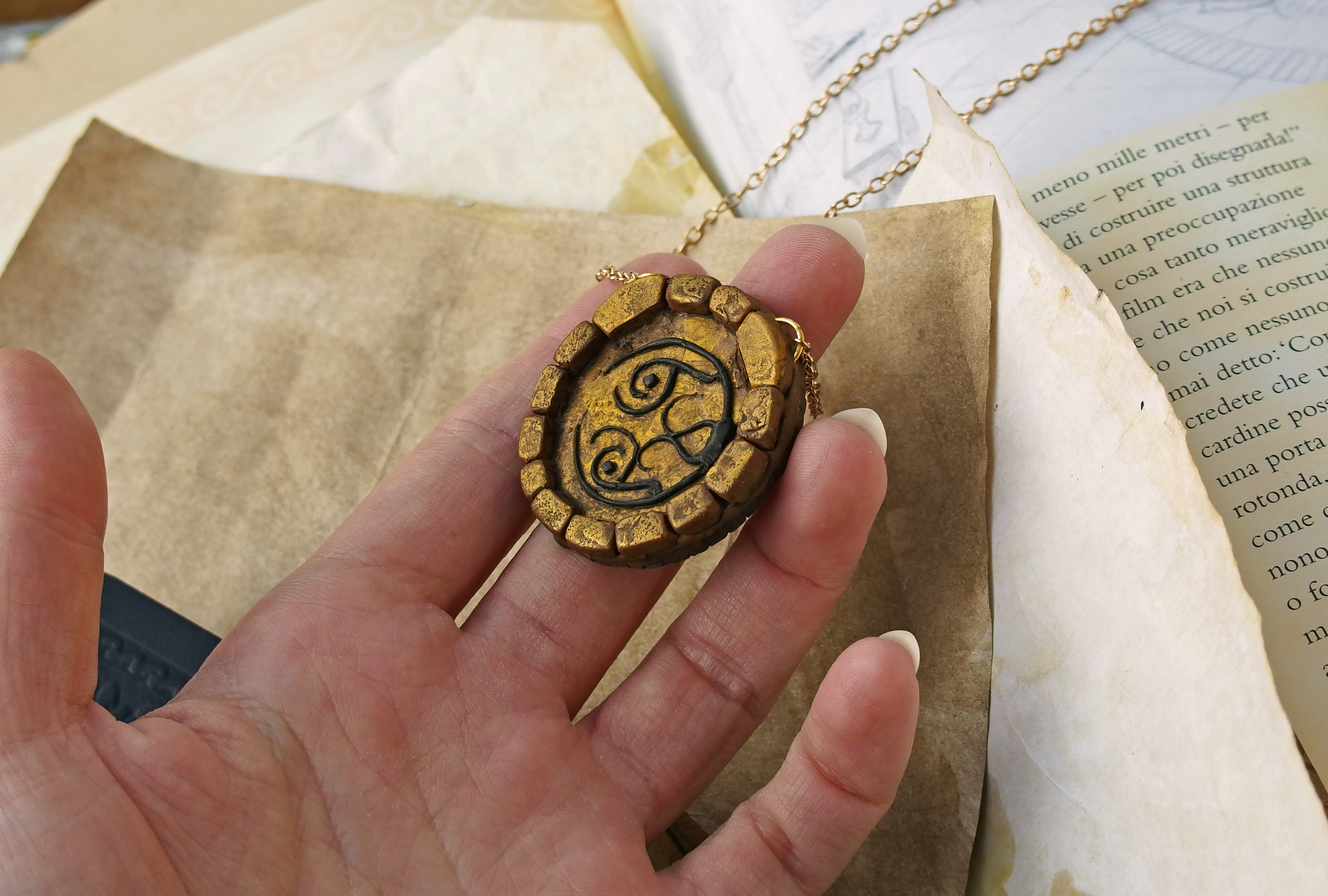 ? This miniature of a fantasy door has a diameter of 3,7 cm (1.46'') and it's attached to an adjustable chain. The necklace can be worn at belly height or as a regular chest height necklace and it's double-faced. The pendant is made in polymer clay and metal wire, it comes in a moss-green organza pouch, ready to be gifted.