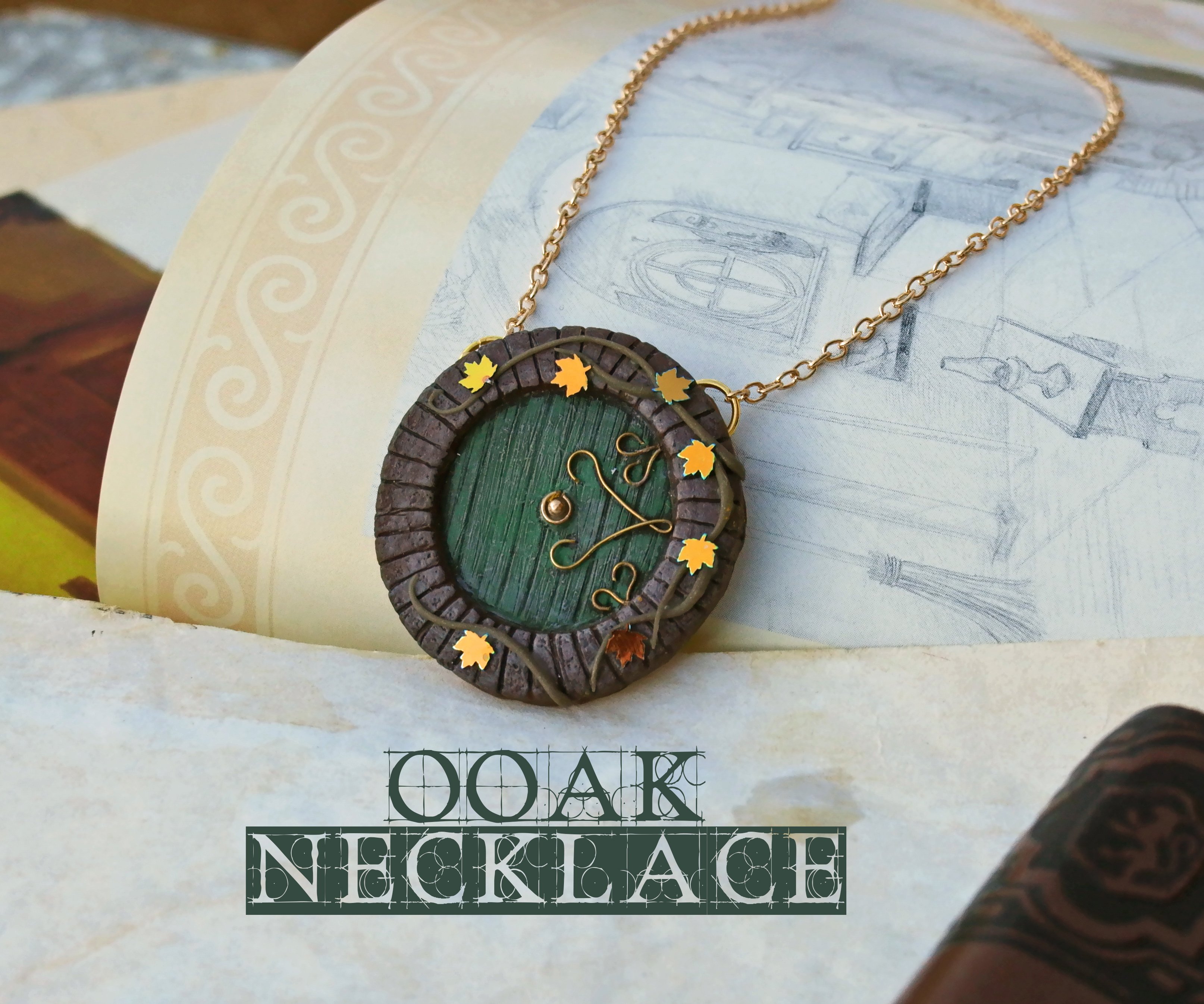 ? I sculpted one side of the pendant at a time, adding unique details both on the porch side and on the inner side of the door, such as acetate foil and metalwork swirls. Each of my doors are made to stand out as unique, like a real door from a Hobbiton house would be.