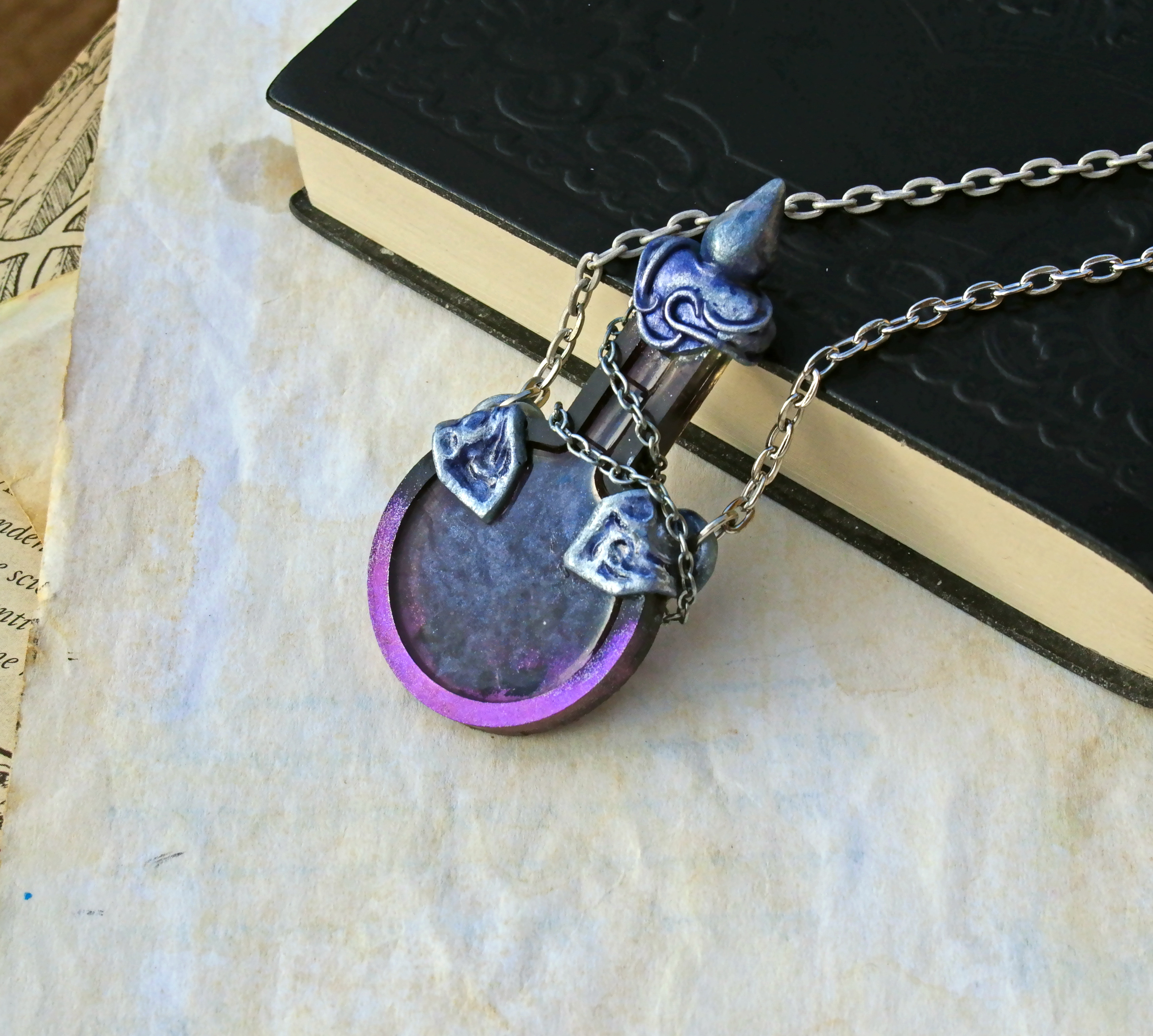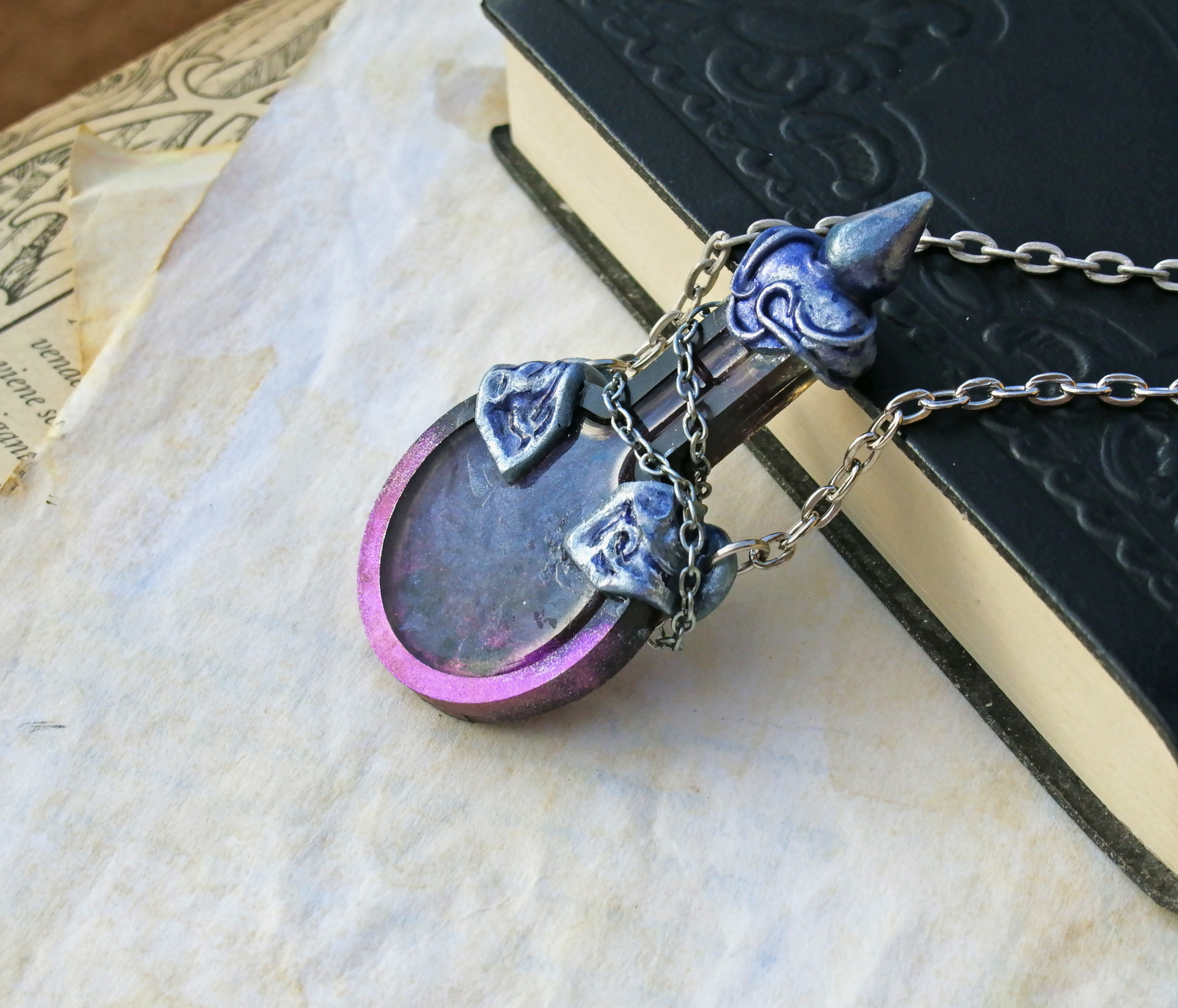 ✨ This project has been a real fun to make. I used a silicone mold bought on a craft supply store to cast the flat bottle shape in resin and then I personalized the final result by experimenting with different color and pigment mixtures, during the second cast for the vial filling. I sculpted the unique decors on the bottle, painting and shading all the details and added matching metal chains.