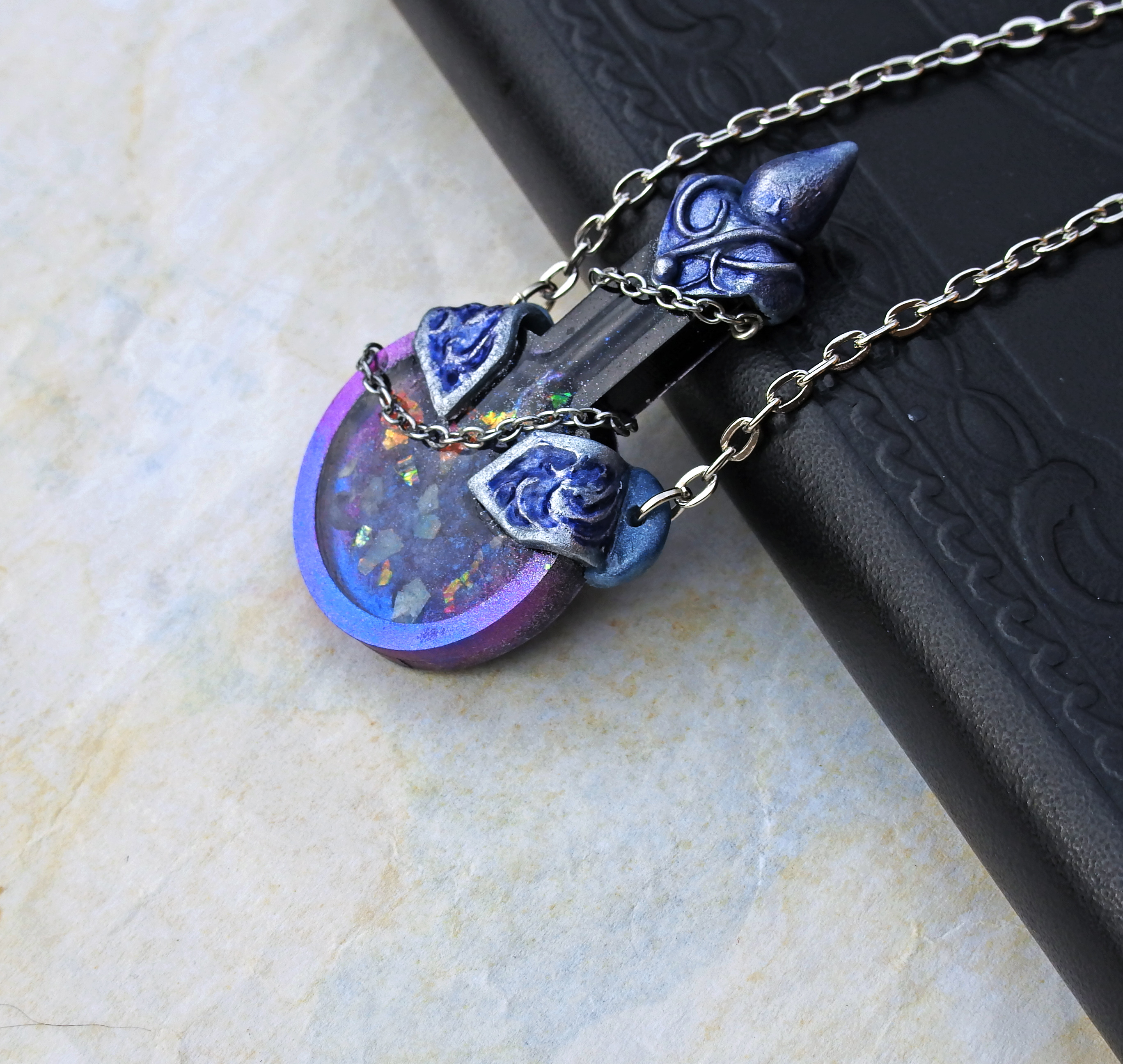 ✨ This project has been a real fun to make. I used a silicone mold bought on a craft supply store to cast the flat bottle shape in resin and then I personalized the final result by experimenting with different color and pigment mixtures, during the second cast for the vial filling. I sculpted the unique decors on the bottle, painting and shading all the details and added matching metal chains.