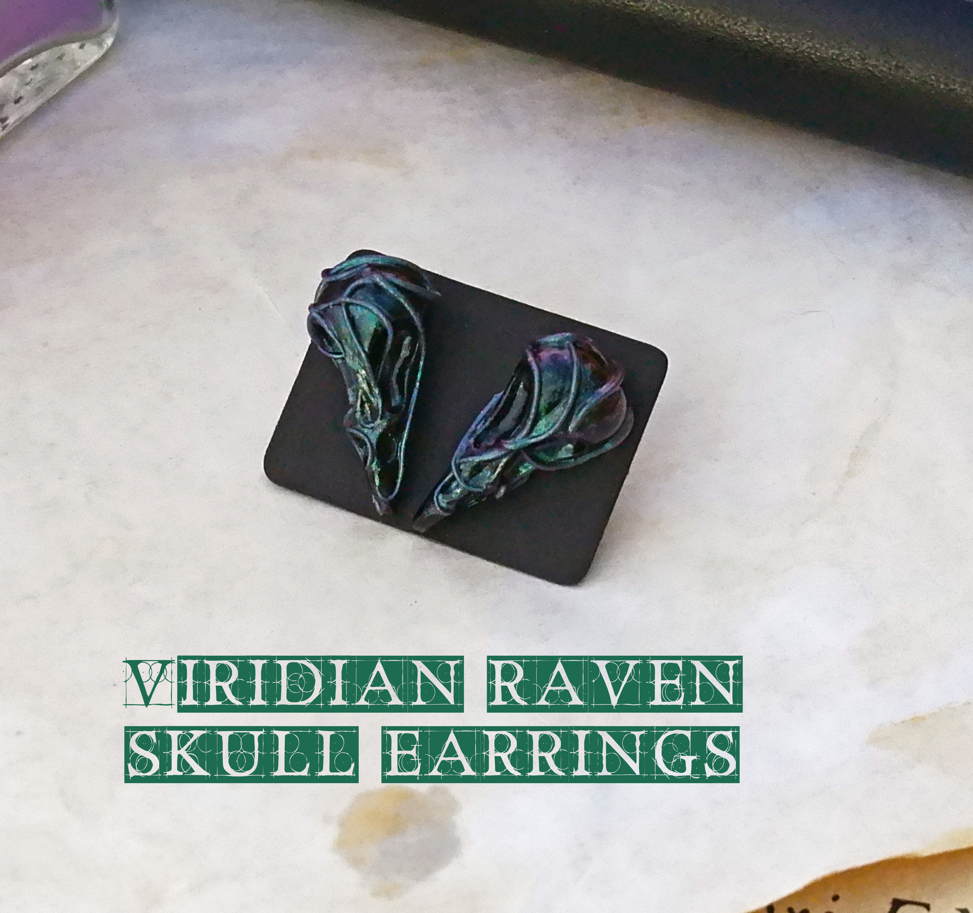 ♄ For this project I worked with some raven skull molds I purchased from a craft supply store. I sculpt polymer clay tendrils to complete the earrings and add a mixture of color-shifting pigments to achieve the final effect.