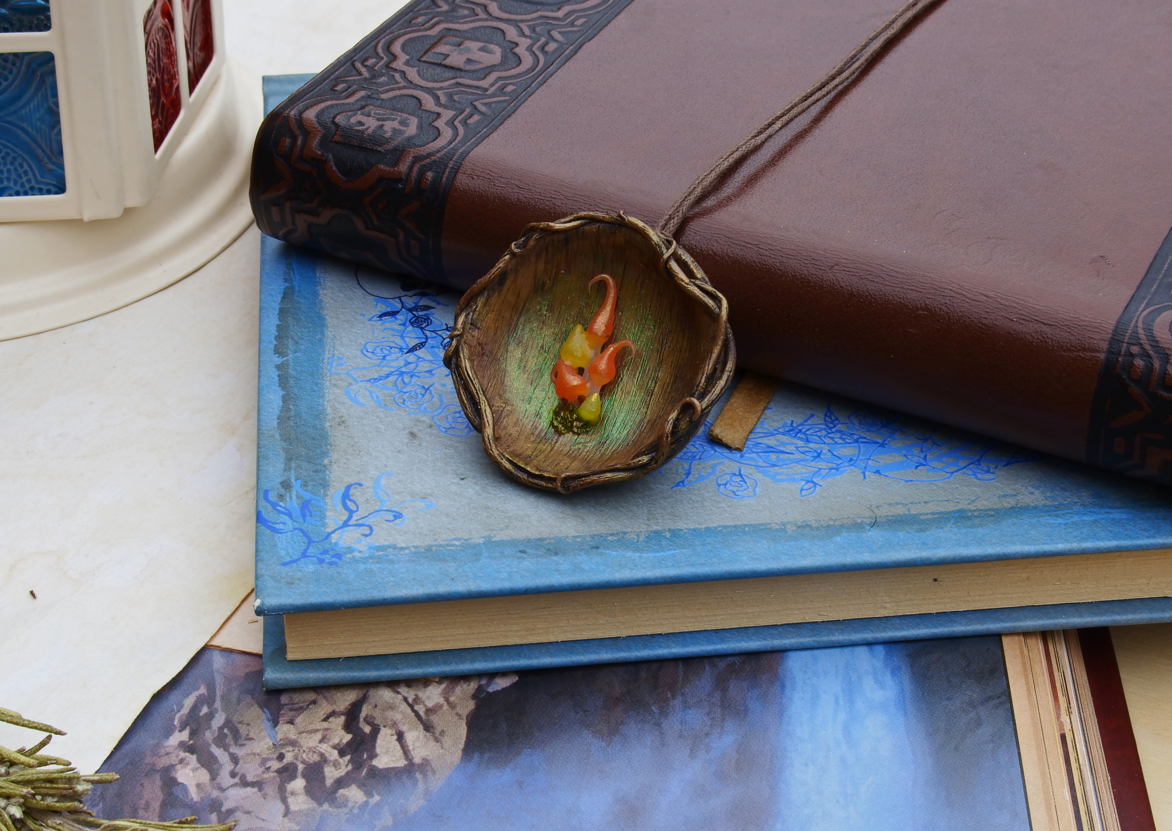 ? I shaped this pendant in polymerclay, adding iridescent and glow in the dark pigments.