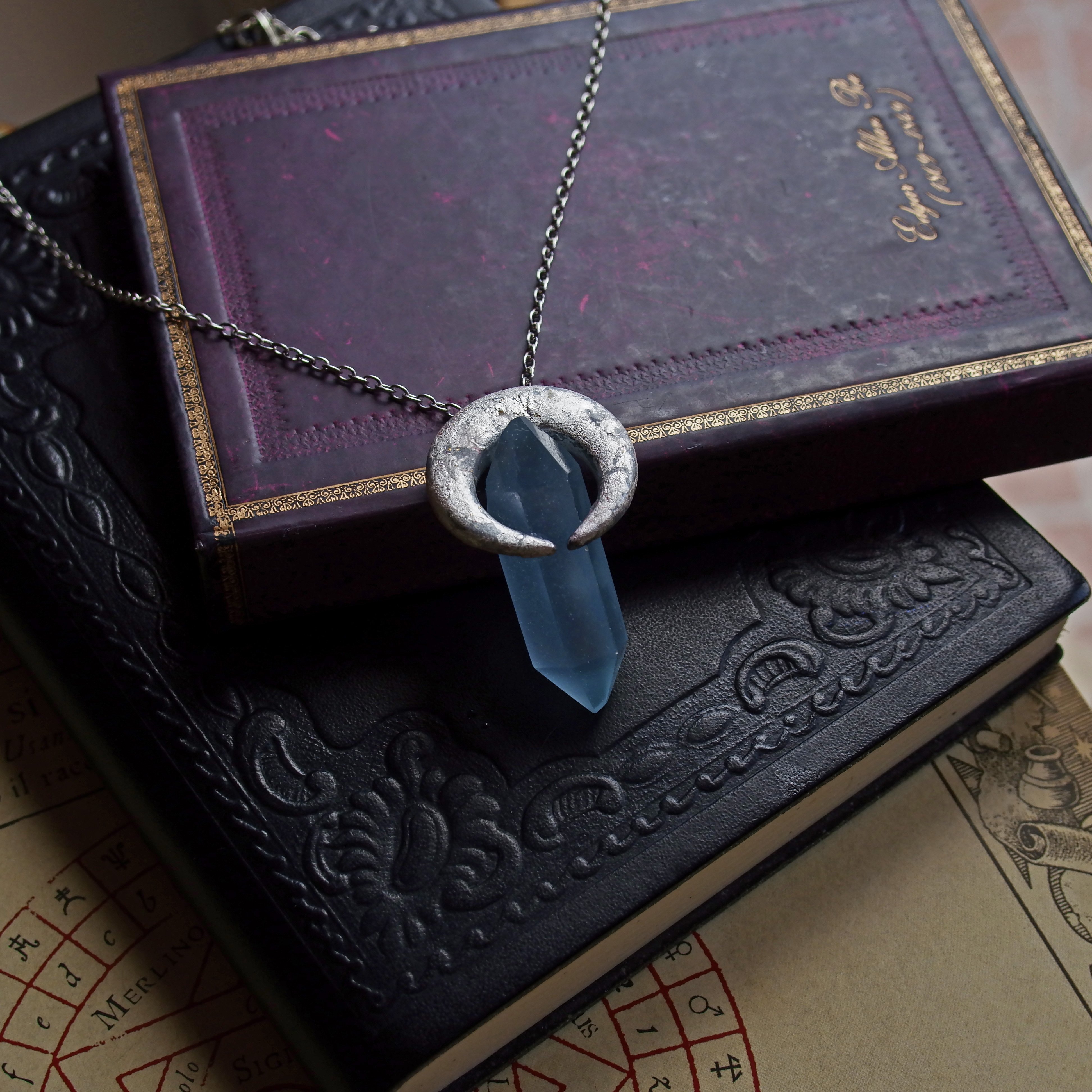 This lightweight resin crystal has the same color of a ray of lunar light. A silver leaf covered crescent surrounds its top part, and connect it with a silvery colored, adjustable chain.