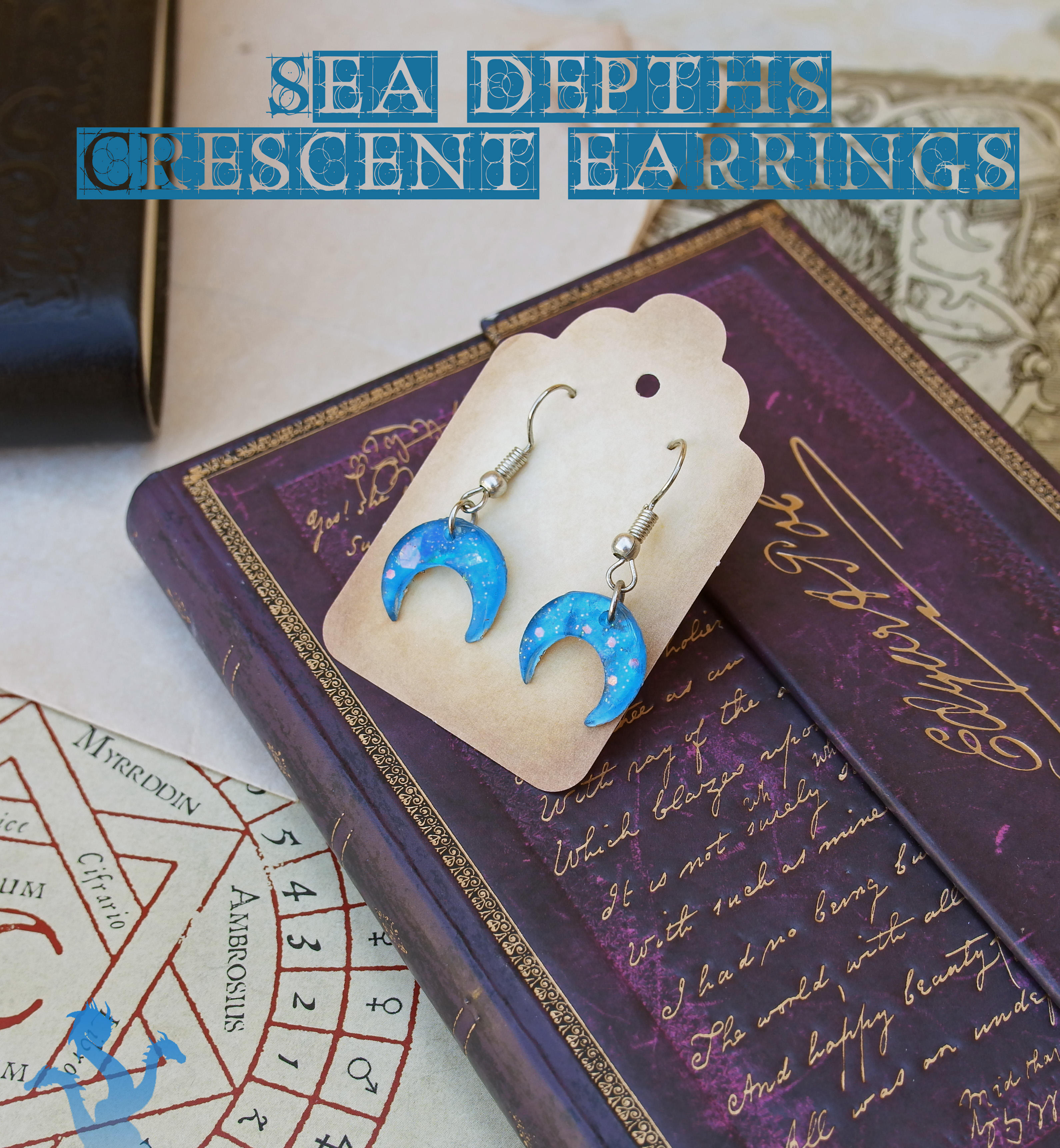 Lights sparkle beneath the surface of two blue crescents, hanging from a silvery earring hook.