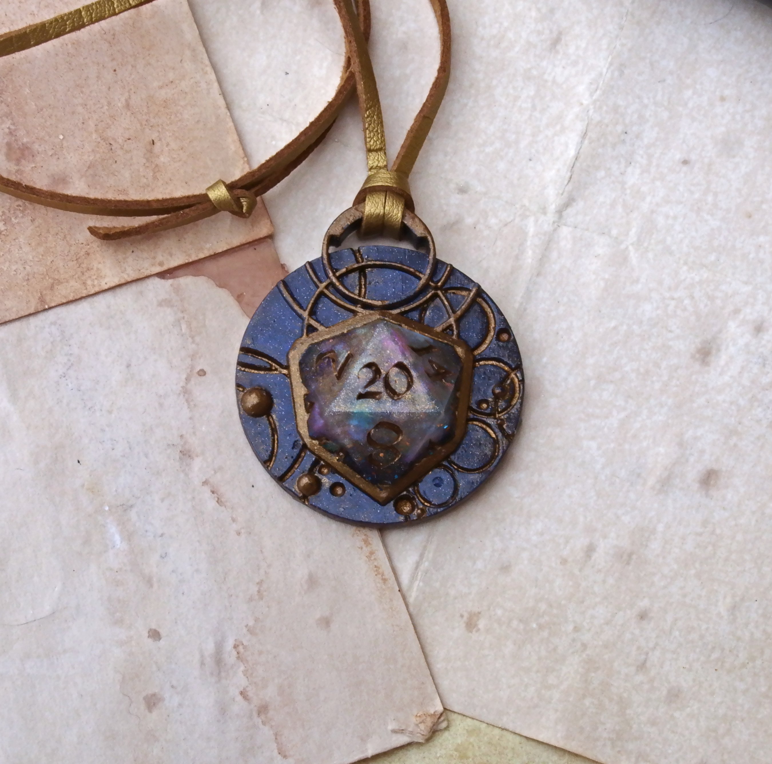 A small nebula with glow in the dark sparkles unravels inside this dice pendant. Golden numbers are carved on each side of this sliced d20, and a cosmic blue geometric frame, with ancient gold accents, completes the pendant.